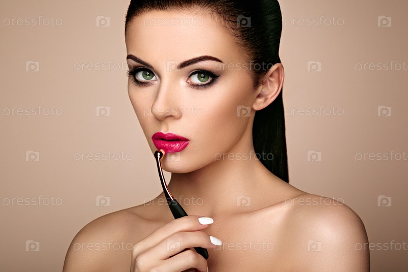 Красивая женщина красит губы губной помадой