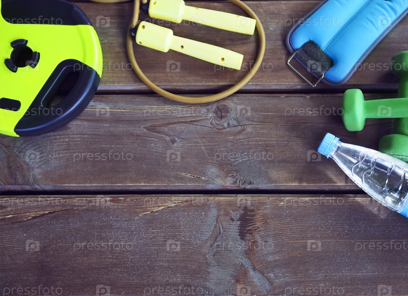 Женский спортивный инвентарь на деревянном фоне