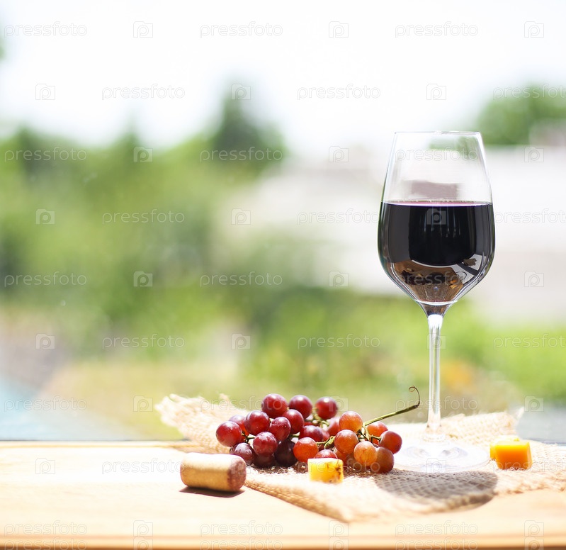 Виноград и сыр с бокалом красного вина