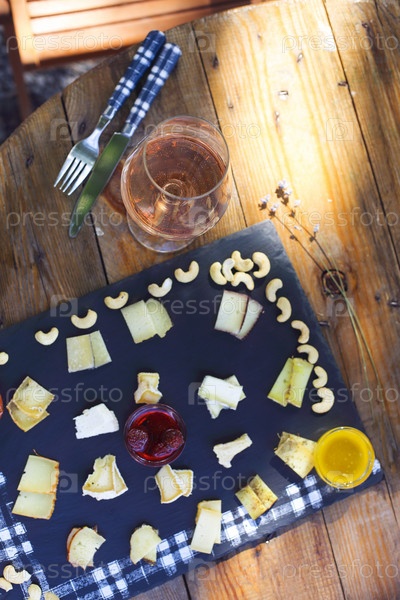 Виноград, набор разных сортов сыра с бокалом розового вина