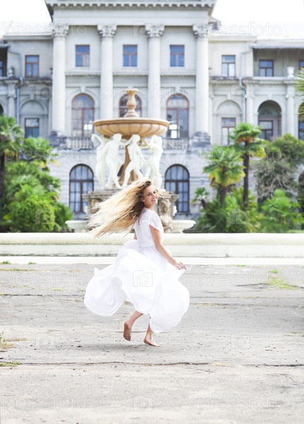 Красивая бегущая невеста в парке