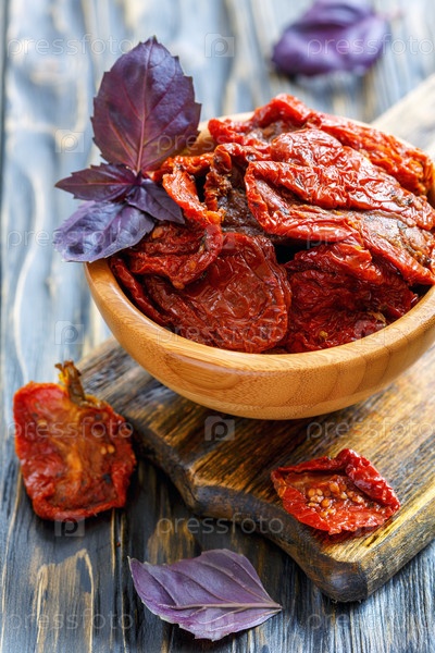 Высушенные на солнце помидоры и красный базилик