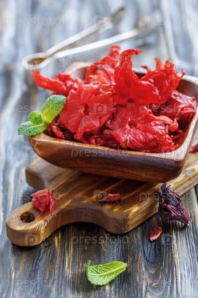 Деревянная миска с высушенными цветами гибискуса
