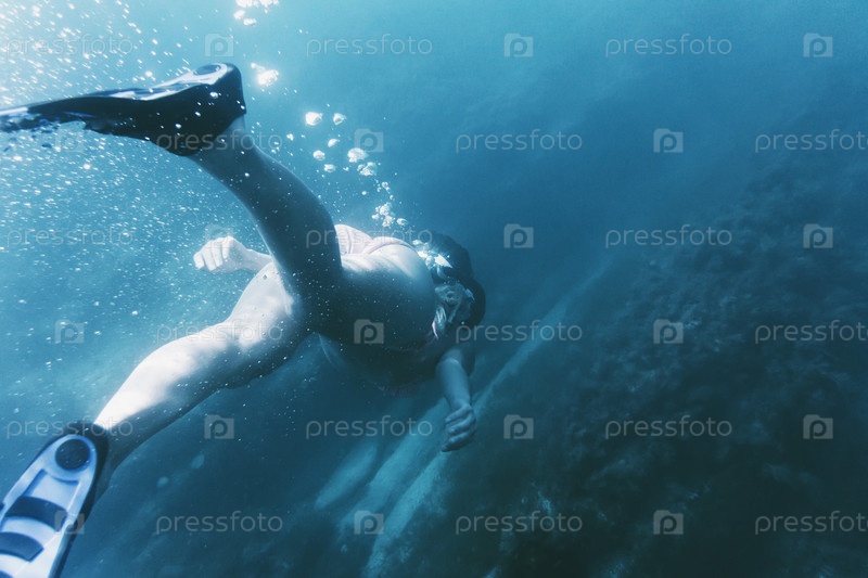 Женщины фридайвер в глубоком море