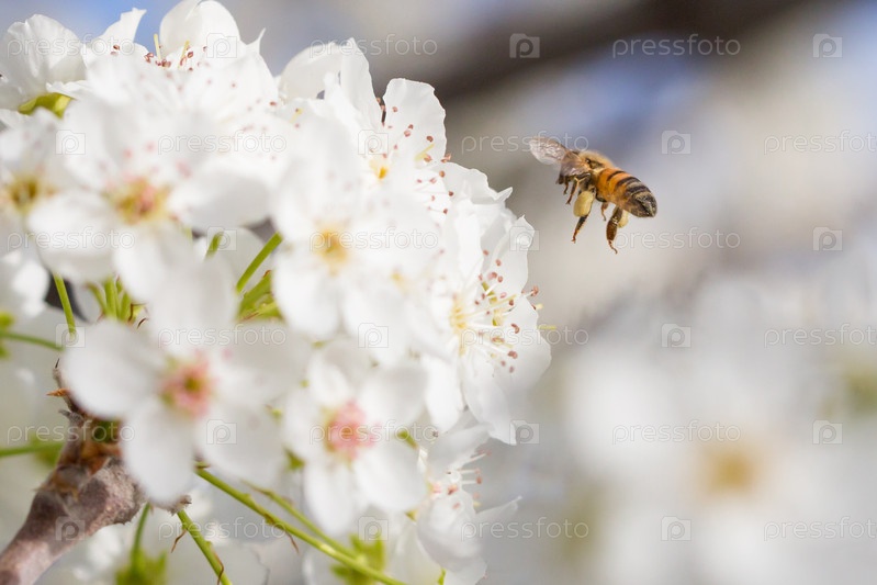 Пчела собирает пыльцу с цветущих почек