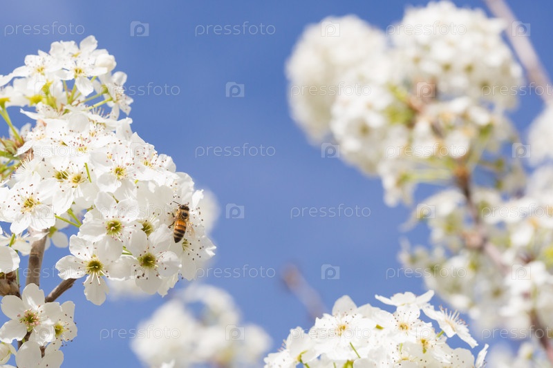 Пчела собирает пыльцу с цветущих почек