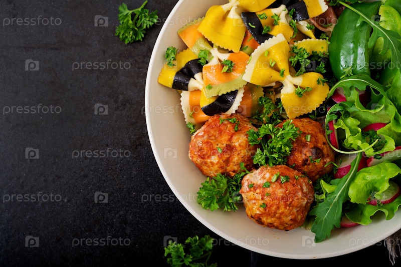 Фарфальская паста с запеченными фрикадельками в томатном соусе и салатом