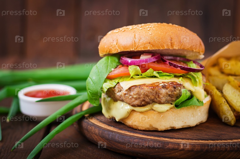Гамбургер с сочной говядиной, сыром, помидором и красным луком