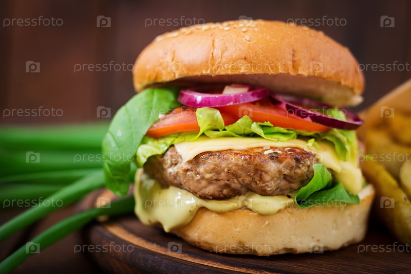 Гамбургер с сочной говядиной, сыром, помидором и красным луком