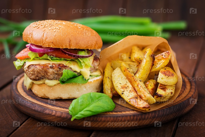 Гамбургер с сочной говядиной, сыром, помидором и красным луком