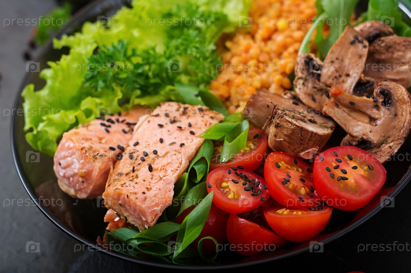 Здоровый салат с лососем, помидорами, грибами, салатом и чечевицей на темном фоне