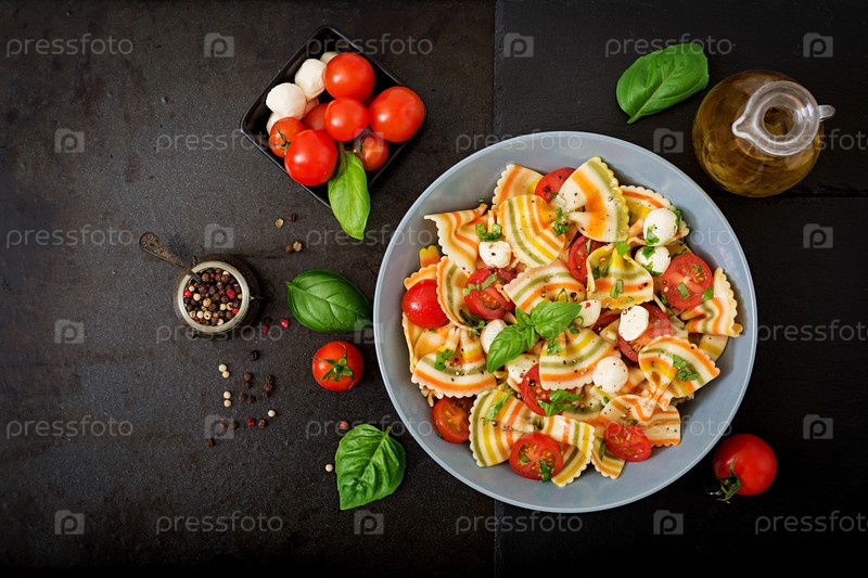 Салат из макаронных изделий с помидорами, моцареллой и базиликом