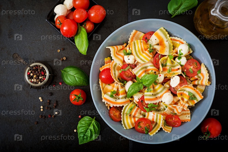 Салат из макаронных изделий с помидорами, моцареллой и базиликом