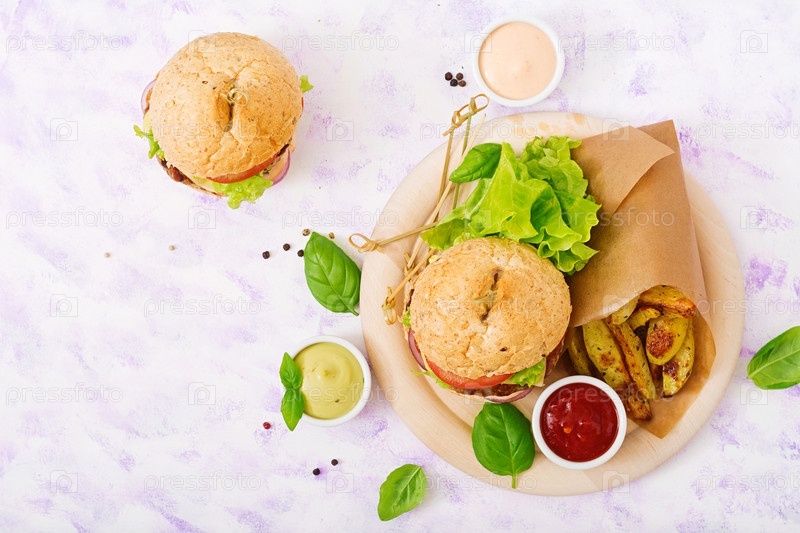 Гамбургер с сочной говядиной, сыром, помидором и красным луком и картофелем фри
