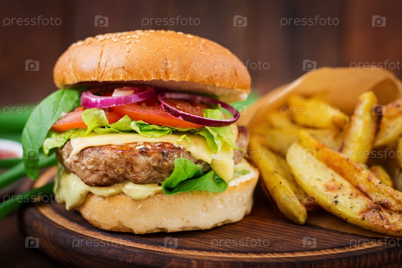 Гамбургер с сочной говядиной, сыром, помидором и красным луком и картофелем фри