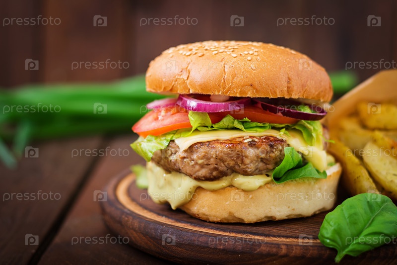 Гамбургер с сочной говядиной, сыром, помидором и красным луком и картофелем фри