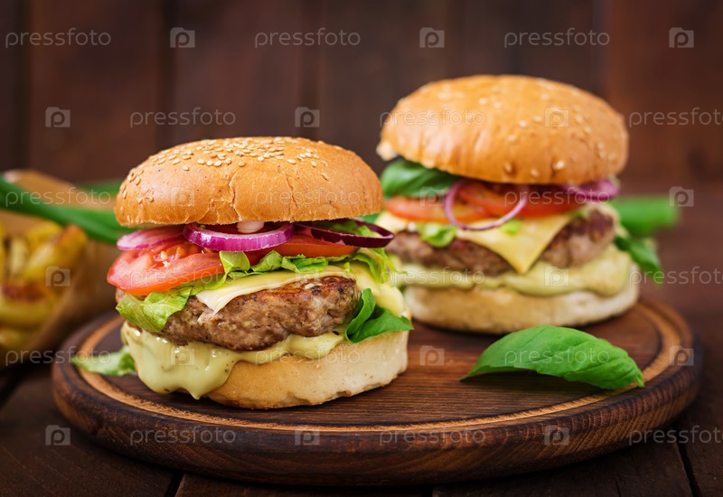 Большой сэндвич - гамбургер с сочной говядиной, сыром, помидором и красным луком