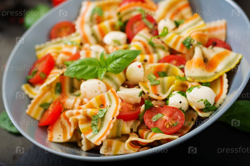 Салат из макаронных изделий с помидорами, моцареллой и базиликом