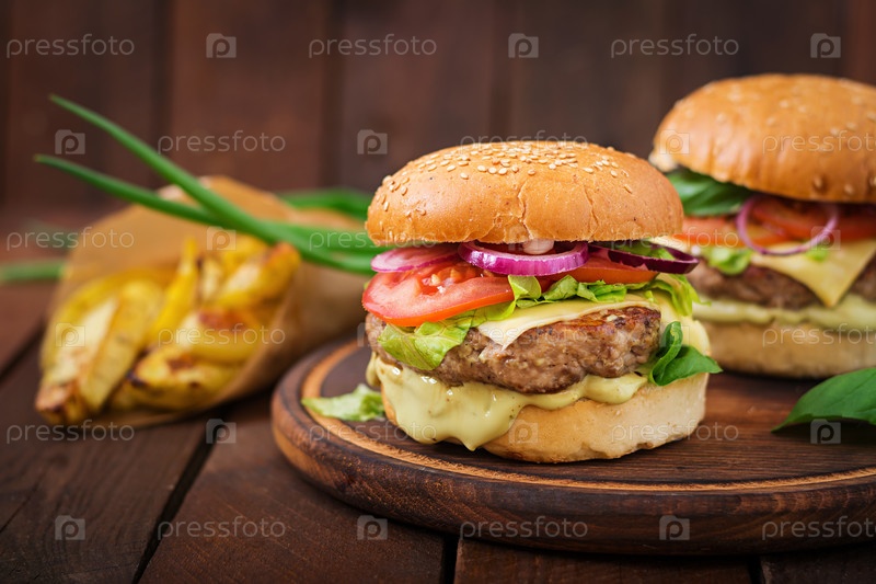 Гамбургер с сочной говядиной, сыром, помидором и красным луком