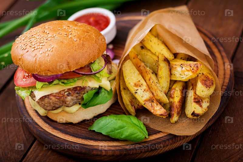 Гамбургер с сочной говядиной, сыром, помидором и красным луком