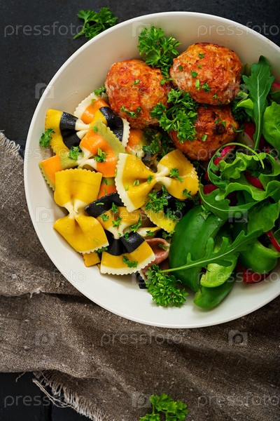Фарфальская паста с запеченными фрикадельками в томатном соусе и салатом