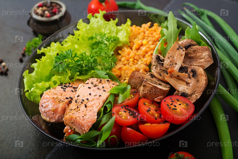 Здоровый салат с лососем, помидорами, грибами, салатом и чечевицей