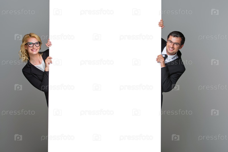 Бизнесмен и бизнес-леди с большим пустым плакатом