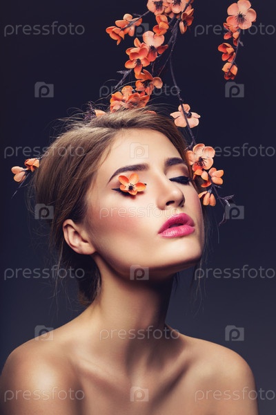 Красивая девушка с веткой сакуры