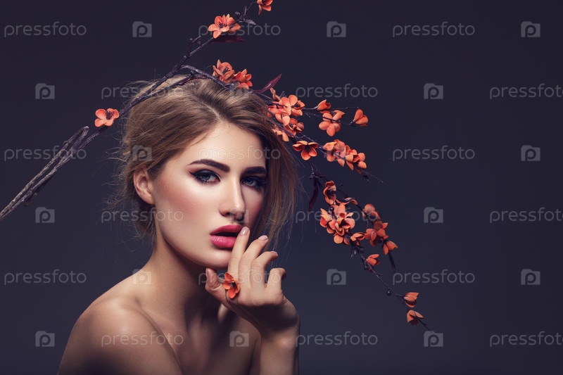 Красивая девушка с веткой сакуры
