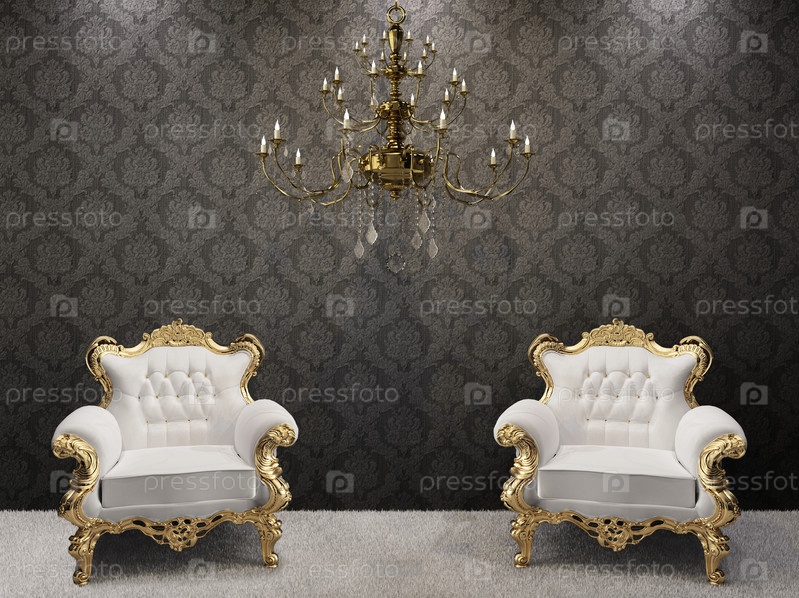 Королевская интерьер. Золотая люстра и два роскошных кресла