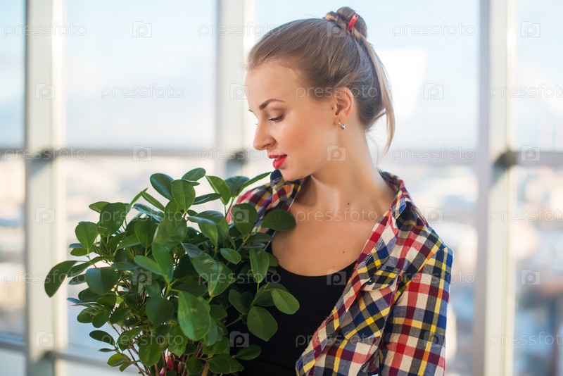 Красивая девушка с комнатным растением в руках