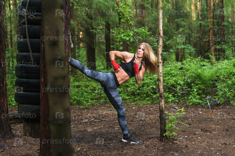 Девушка отрабатывает удары в лесу