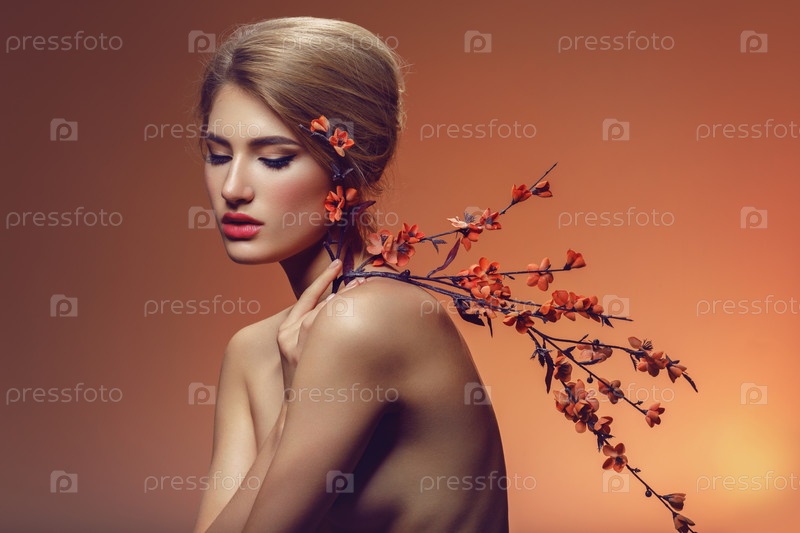 Красивая девушка с веткой сакуры