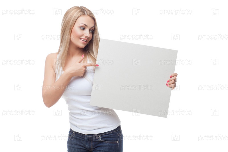 Красивая блондинка держит пустой плакат