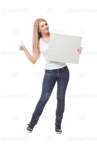 Красивая блондинка держит пустой плакат