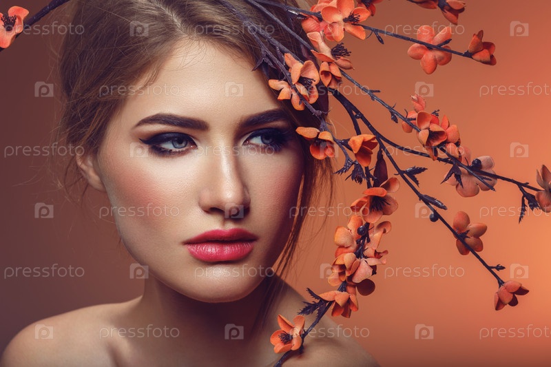 Красивая девушка с веткой сакуры