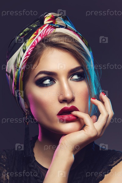 Красивая девушка с ярким макияжем и шалью на голове