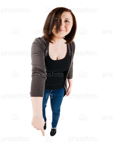 Юная симпатичная девушка показывает пальцем вниз