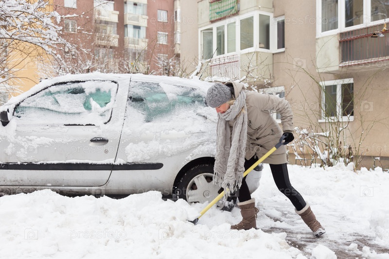 Женщина убирает снег лопатой