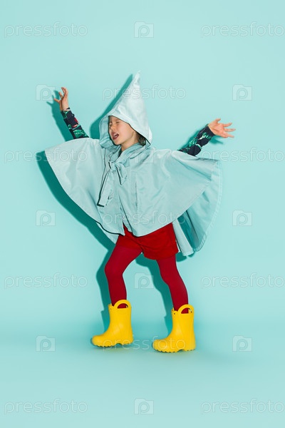 Маленькая веселая девочка в голубом плаще