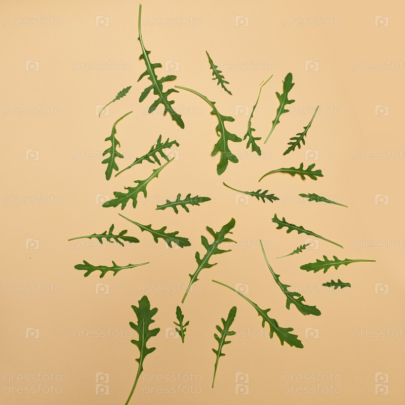 Свежие листья рукколы на бежевом фоне
