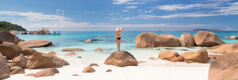 Женщина на пляже на острове Праслин, Сейшельские острова