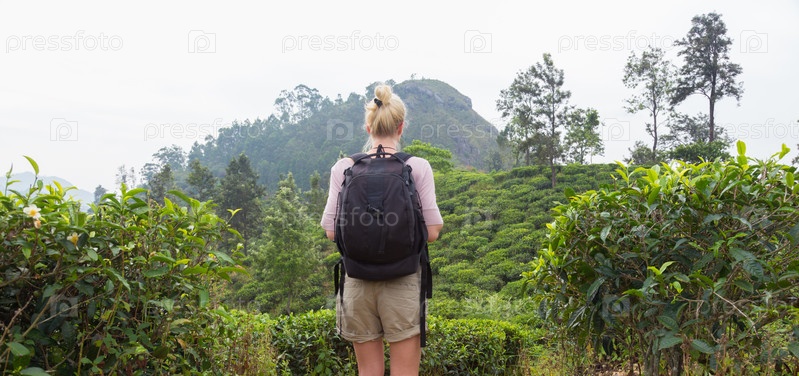 Турист-женщина наслаждаются красивой природой чайных плантаций, Шри-Ланка