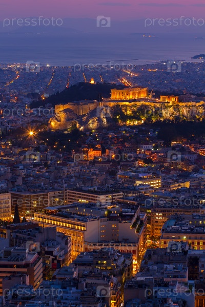 Городской пейзаж Афин ночью, Греция