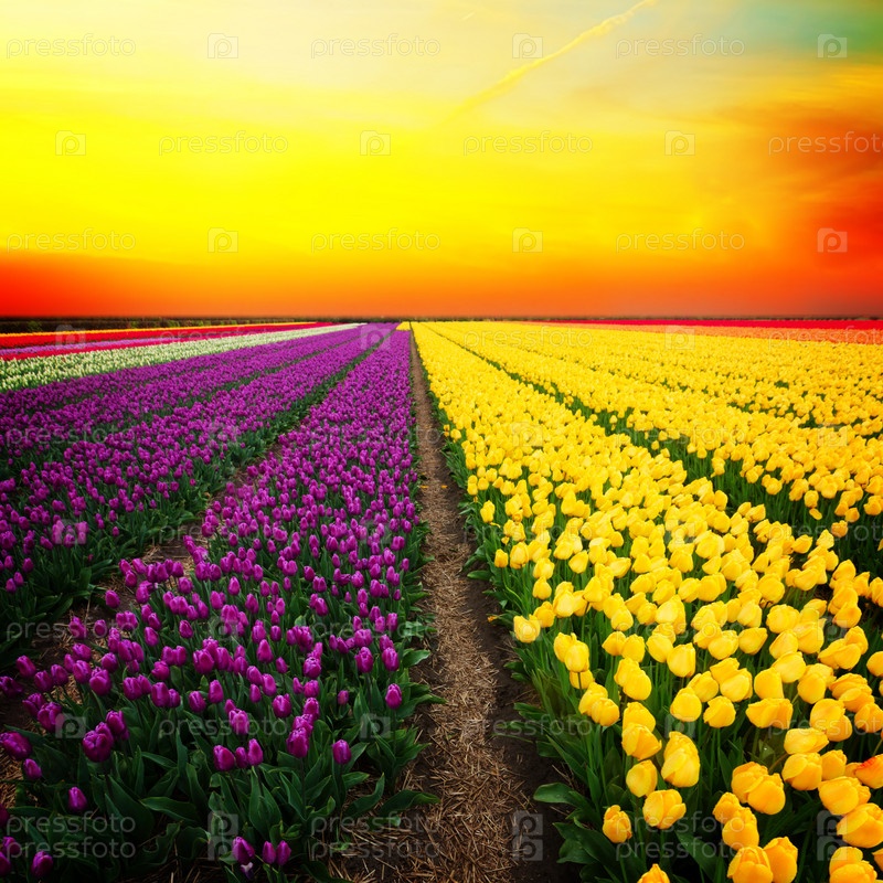 Голландские желтые и фиолетовые тюльпаны в солнечный день