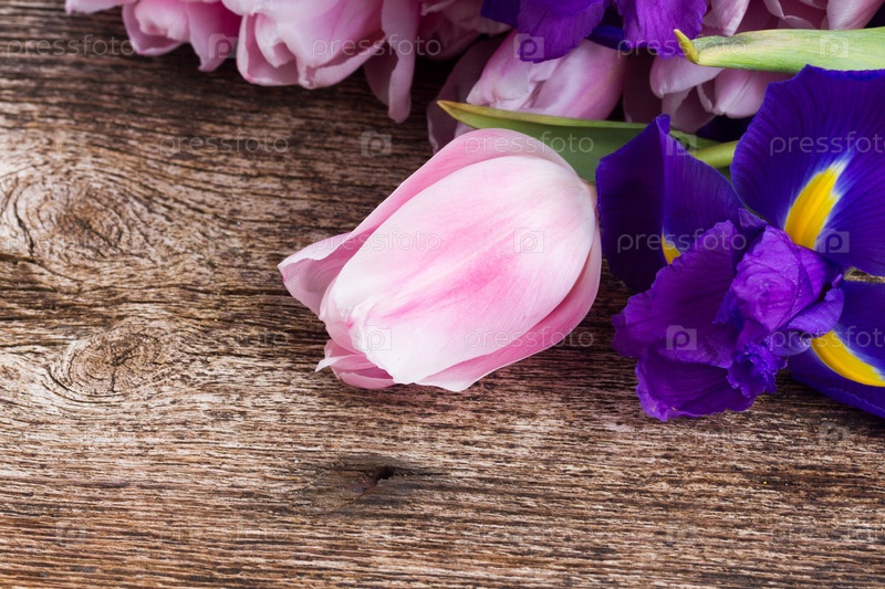 Синие ирисы и тюльпаны
