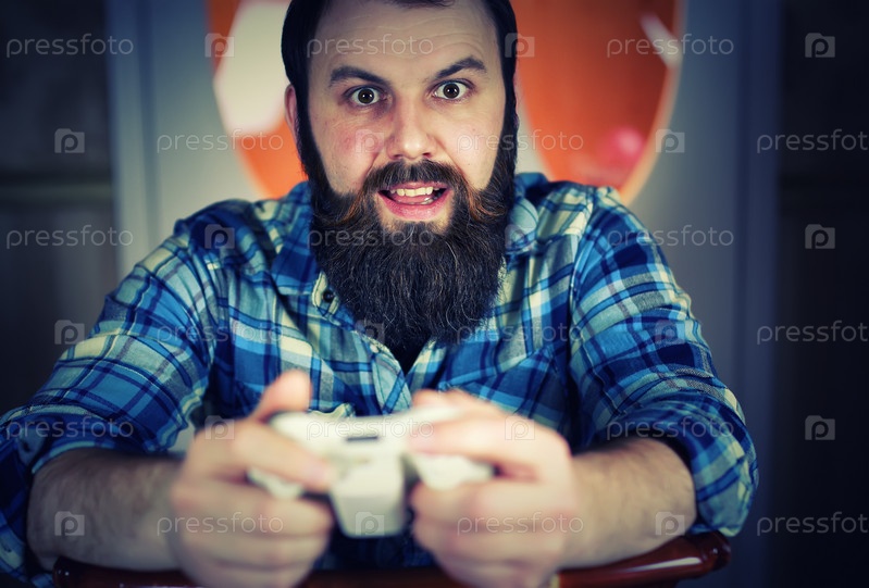 Бородатый мужчина играет с джойстиком