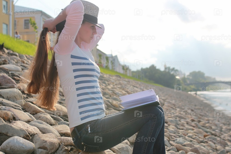 Девушка читает книгу у реки