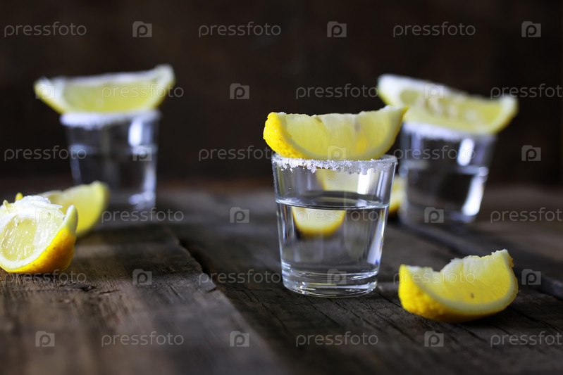 Текила с солью и лимоном на деревянном фоне