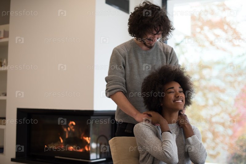 Многоэтнического пара обнимается перед камином